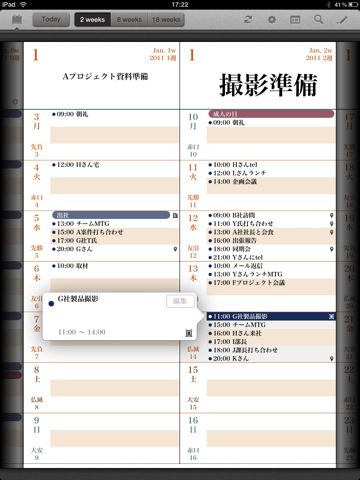 iPad版「『超』整理手帳」最大の特色は、表示期間を2週分、8週分、18週分と自分の使い勝手に応じて一覧表示が選べる点だ。先の先まで一目でチェックできるほか、週や月をまたぐスケジューリングもスムーズに行える。各段階ごとの表示はワンタッチで可能だ。