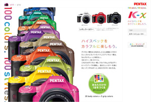 なお、オーダーカラー受注サービス「PENTAX K-x 100colors,100styles.」も開始する。カメラ本体20色とグリップ各5色(全9色)の組み合わせによる全100種類から自由に選べるもので、注文は、カタログを利用する方法と、専用サイトを利用する方法がある。