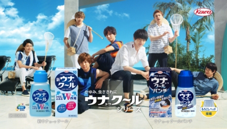 燦々と輝く太陽のもと、「虫に刺されたの?」とクールに問いかける北山。プールサイドでは藤ヶ谷が「そんな時には、ウナクール」と囁く。真っ赤なオープンカーにもたれながら腕に「新ウナコーワクール」を塗り、「効くゥゥー・・・」と気持ちよさそうなのは玉森。3人は持参した「新ウナコーワクール」とともに、ビーチリゾートでのバカンスを満喫中のようだ。一方、虫取り網を手に、麦わら帽子姿で草むらをかき分けてやって来たのは千賀、宮田、横尾、二階堂の4人。「虫さされに!速く効く~!」と元気いっぱいに駆け出し、こちらも野山で過ごす夏休みを満喫している様子。海に山にアウトドアで大活躍の「新ウナコーワクール」。最後は7人が勢ぞろい。「かゆみによく効くべウナクール!」と声を合わせて決めポーズもバッチリ!