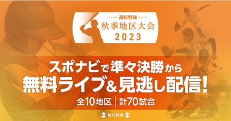 毎日新聞は、北海道から九州まで全国10地区で争われる秋季高校野球地区大会で、準々決勝以上の合計70試合をヤフー株式会社が運営するスポーツ総合サイト「スポーツナビ」で無料ライブ配信を行う。