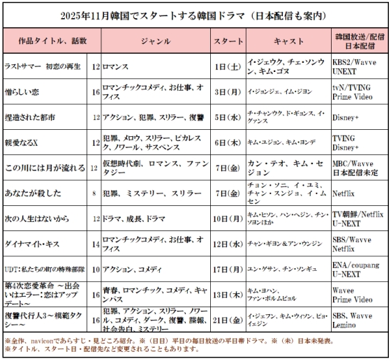2025年11月も、韓国ではジャンルもキャストもバラエティ豊かで、韓ドラファン必見の話題作が続々と放送・配信される。ここでは主な新作韓国ドラマラインアップとキャスト、見どころ、日本での配信情報について紹介する。新情報が入り次第、随時追記する。
