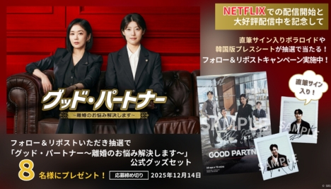 韓国ドラマ「グッド・パートナー~離婚のお悩み解決します~」が、ついにNETFLIXで配信スタート。これを記念して、公式X(旧Twitter)では豪華賞品が当たるプレゼントキャンペーンが行われている。