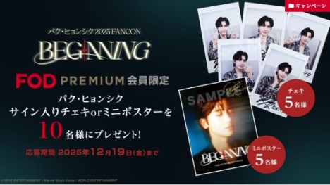 人気韓国俳優パク・ヒョンシクの初のファンコンサート『パク・ヒョンシク 2025 FANCON [BEGINNING]』を12月5日(金)よりFODにて独占配信。これを記念して、FODプレミアム会員限定で、パク・ヒョンシク直筆サイン入りグッズが当たるプレゼントキャンペーンを開催する。
