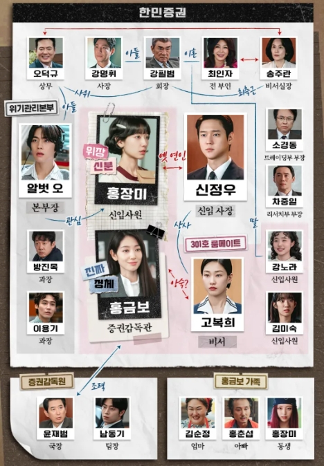男/35歳。証券監督院 資本市場調査局 チーム長。グムボの同期入社。突出して活躍するグムボを妬み、嫉妬することに相当なエネルギーを費やしている。グムボを引きずり下ろすためなら手段や方法を選ばず全力を尽くすが、なかなか思うようにいかず焦りを募らせている。ハンミン証券のオ常務に、証券監督院の対外秘情報を横流しするスパイ役を担っている。