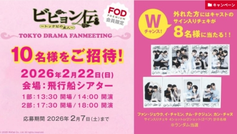 今回のキャンペーンでは、2026年2月に東京で開催されるドラマファンミーティングに抽選で10名を招待。さらに外れた人の中から、キャストのサイン入りチェキが当たるWチャンスも用意されている。