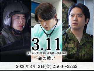 東日本大震災から15年。迫り来る放射線の恐怖の中、命を賭けて戦った人々に焦点をあてたドラマ「3.11~東日本大震災15年 福島第一原発事故 命の戦い~」2026年3月13日22時からフジテレビで放送する。白洲迅、戸塚純貴、三浦貴大がそれぞれの立場で命を張った人々を演じる。予告動画がフジテレビ公式YouTubeチャンネルで公開されている。